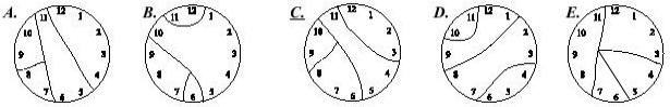 12Il quadrante di un orologio viene scomposto in quattro parti. Prendendo queste parti in un ordine opportuno e sommando i numeri contenuti in ciascuna di esse, si ottengono quattro numeri consecutivi. Esiste un solo modo di scomporre il quadrante se si vuole ottenere un tale risultato. Qual è?