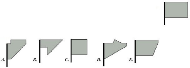15Dalla finestra della sua stanza Carla guarda il muro della casa di fronte. Può vedere che vi è una bandiera rettangolare, come quella in figura, che garrisce al vento. Carla osserva la bandiera in momenti diversi. Supponendo che la bandiera non si strappi per la forza del vento, quale delle 5 immagini riportate sotto Carla non potrà mai vedere?