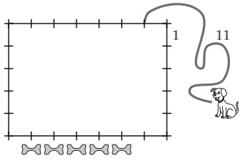 11Osserva la figura: Daniele ha legato il suo cane a un metro dall’angolo di un’edicola con pianta rettangolare i cui lati misurano 7 m e 5 m. Il guinzaglio è lungo 11 m. Ci sono 5 giochini a forma di osso nelle posizioni che vedi in figura: quanti di essi possono essere raggiunti dal cane?