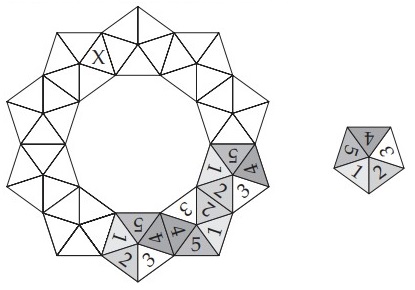 15Amalia vuol costruire una coroncina usando 10 copie del gettone che vedi a destra e vuole che quando due gettoni condividono un lato i numeri corrispondenti coincidano. Ha già disposto 3 gettoni con questo criterio. Quale numero si troverà alla fine nel triangolo denotato con X?