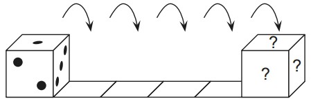 17Se osservi un dado standard vedi che, per ognuna delle tre coppie di facce opposte, il numero di puntini complessivamente presenti sulle due facce opposte è 7. Il disegno mostra un dado standard che è stato messo nella prima casella di una striscia lunga sei caselle e poi verrà fatto rotolare verso destra lungo la striscia. Quando il dado raggiungerà l’ultima casella, quale sarà il numero totale di puntini sulle tre facce indicate con punti interrogativi?