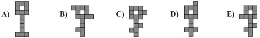 23Quale delle seguenti “chiavi” non può essere tagliata in tre pezzi tutti diversi tra loro composti ciascuno da cinque quadratini grigi?