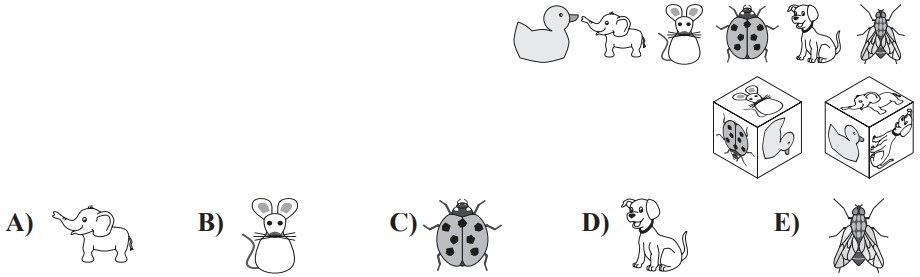 7Giorgio incolla sei adesivi con immagini di animali, ciascuno su una faccia di un cubo. La figura qui a lato mostra il cubo in due posizioni differenti. Quale adesivo sta sulla faccia opposta a quella con l’anatroccolo?