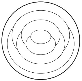 9Cinzia colora ogni regione in cui è suddiviso il cerchio che vedi sotto o di rosso o di giallo o di blu, facendo in modo che regioni che si toccano ricevano colori diversi. Cinzia colora di rosso la regione più esterna; dopo che tutto il disegno è stato colorato, quante regioni risultano colorate di rosso?