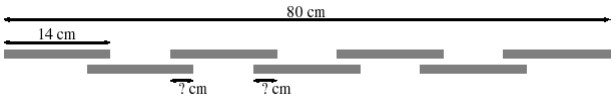 21I sette bastoncini grigi nella figura hanno la stessa lunghezza; lo spazio libero tra uno loro ed il successivo sulla stessa riga è sempre lo stesso. Qual è la lunghezza di ognuna delle due parti uguali segnate con un punto interrogativo?