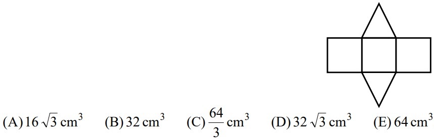 12La figura mostra lo sviluppo piano di un solido delimitato da tre quadrati di lato 4 cm e due triangoli equilateri. Qual è il volume del solido?