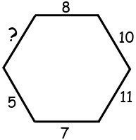 19In ciascuno dei vertici dell'esagono che vedi in figura c'era un certo numero di sassolini; su ciascun lato è riportata la somma dei sassolini che erano presenti nei due vertici adiacenti. Quanto vale la somma mancante?