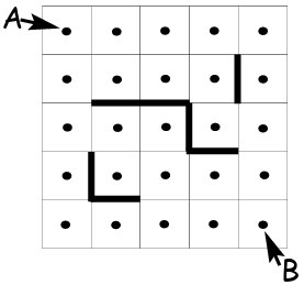 20In figura è rappresentato un quadrato suddiviso in 25 quadretti, in ciascuno dei quali è segnato il centro; con tratto più spesso sono segnati 3 ostacoli. Vogliamo andare da A a B passando da un centro all'altro solo per linee verticali e/o orizzontali, evitando gli ostacoli e per la via più breve. Quanti sono i cammini da A a B che rispettino tutte queste condizioni?