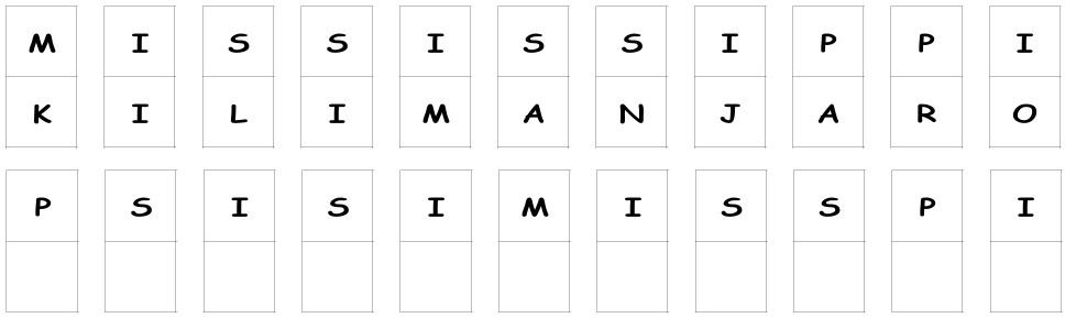 23Sulla prima striscia vedi 11 carte, ciascuna con due lettere. Sulla seconda vedi le stesse carte ordinate in maniera diversa. Quale delle scritte che seguono può apparire nella seconda riga della seconda striscia di carte?