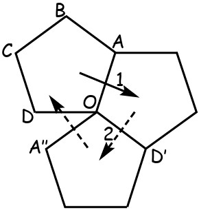 29In figura è rappresentato un pentagono regolare OABCD ed i pentagoni che da esso si ottengono facendo prima una rotazione di centro O che porti il lato OD a sovrapporsi al lato OA (e OA a OD'), poi una rotazione di centro O che porti il lato OA a sovrapporsi al lato OD' (e OD' a OA''). Continuando in questo modo, qual è il minimo numero di rotazioni sufficienti a riportare il pentagono nella posizione iniziale?